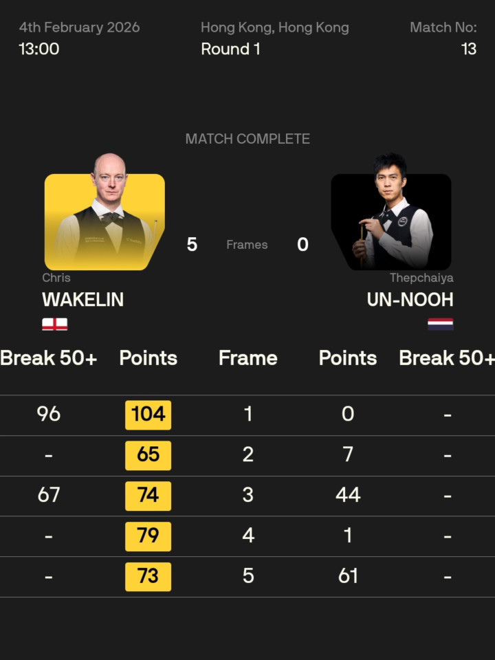两东谈主此前7次交手,塔猜亚5胜2负越过,且已杀青两连胜。本场比赛,克里斯·韦克林打出单杆96、67分,一波五连鞭,直落五局,完好复仇,以5-0慑服塔猜亚·乌努,晋级16强。