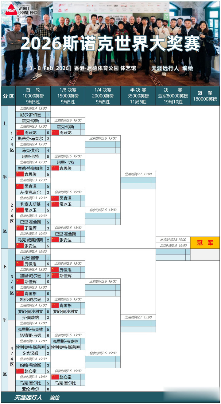 最新即时更新2026斯诺克寰宇大奖赛程度签表,一表看寰宇大奖赛全程,诸位看官敦厚敬请转发储藏,以备备而无谓