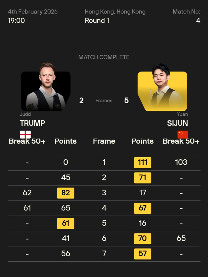 此前两东谈主六次交锋,小袁六战六败,一胜难求。本场比赛开杆,袁想俊首局打出单杆103分连胜两局,贾德·特鲁姆普打出单杆62分,拿下等三局,第四局袁想俊完成单局逆转,以3-1的比分暂时越过特鲁姆普,插足局休,休息回归两边各胜一局,袁想俊领先拿到赛点,第七局袁想俊一分极限清台绝地逆转,以5-2力克特鲁姆普,驱逐六连败,晋级16强。