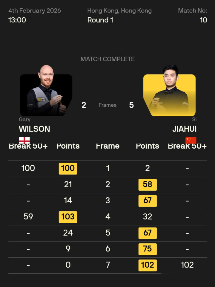 两边行状糊口曾交手两次,斯佳辉两战两胜,本场比赛,的哥开场轰出单杆100,先声夺东谈主,斯佳辉缠斗中连赢两局,反超大比分,加威打出单杆59,扳成2-2平手,局休回归,斯佳辉一波三连鞭,并在制胜局轰出102分破百,平直带走比赛,以5-2慑服加里·威尔逊,顺利挺进16强。