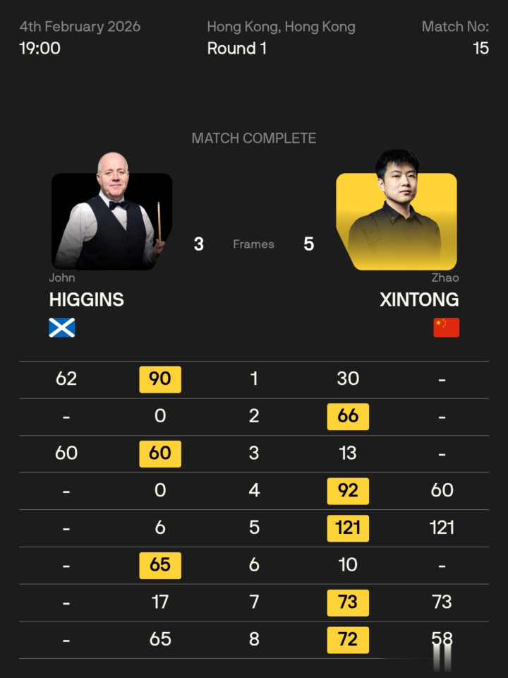 两边行状糊口曾交手12次,希金斯8胜4负越过,当今已是五连胜,2021英锦赛之后,四年多的工夫里,赵心童一胜难求。本场比赛,约翰·希金斯打出62、60分,赵心童打出60、121、73分,两东谈主互有赢输,战至3-3平,第七局赵心童冲击147,打丢第10颗黑球,得回73分,先达赛点,第八局希金斯打出一杆极其精彩的清台,战成延分,两边争黑,希金斯留住黑球契机,赵心童攻下黑球锁定比赛,最终赵心童5-3希金斯,驱逐五连败,晋级16强。