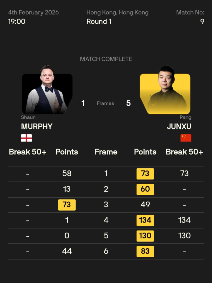 北京工夫2月4日22时31分,2026斯诺克寰宇大奖赛首轮后半程的八场角逐,在香港启德体育公园体艺馆,一谈决出了赢输,赛会16强整个产生,中国球员斯佳辉、庞俊旭、赵心童、袁想俊四战全胜。
