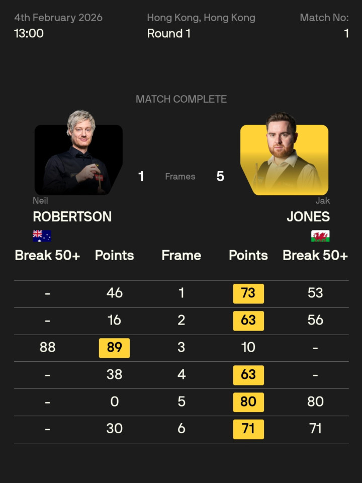本场比赛,杰克·琼斯打出53、56、80、71分,开场连下两城,罗伯逊打出单杆88,扳回一城,琼斯接着又是一波三连鞭,以5-1淘汰卫冕冠军、单赛季排行第一的尼尔·罗伯逊,晋级16强。