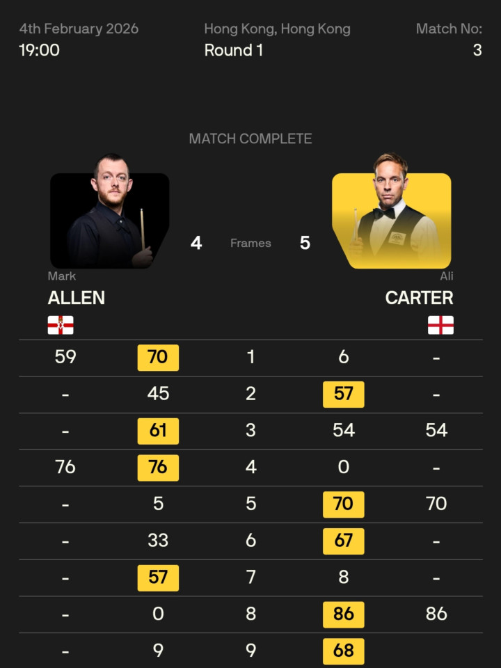 阿里·卡特打出54、70、86分三杆50+,马克·艾伦打出59、76分,两边你来我往,死战至决胜局,卡特收拢契机完成超分,以5-4慑服艾伦,晋级16强。