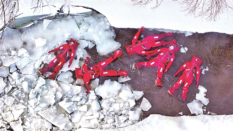 旅客在内蒙古境内的吉尔布干河不冻河额尔古纳段体验“冰浮”名目。王正摄/光明图片
