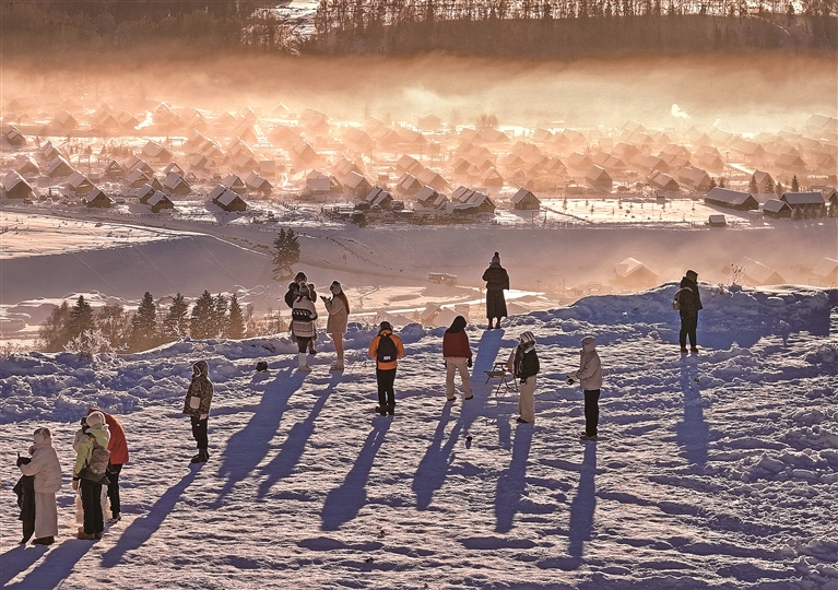 新疆阿勒泰禾木村日出时间,不少旅客在山坡旅拍。光明图片/视觉中国
