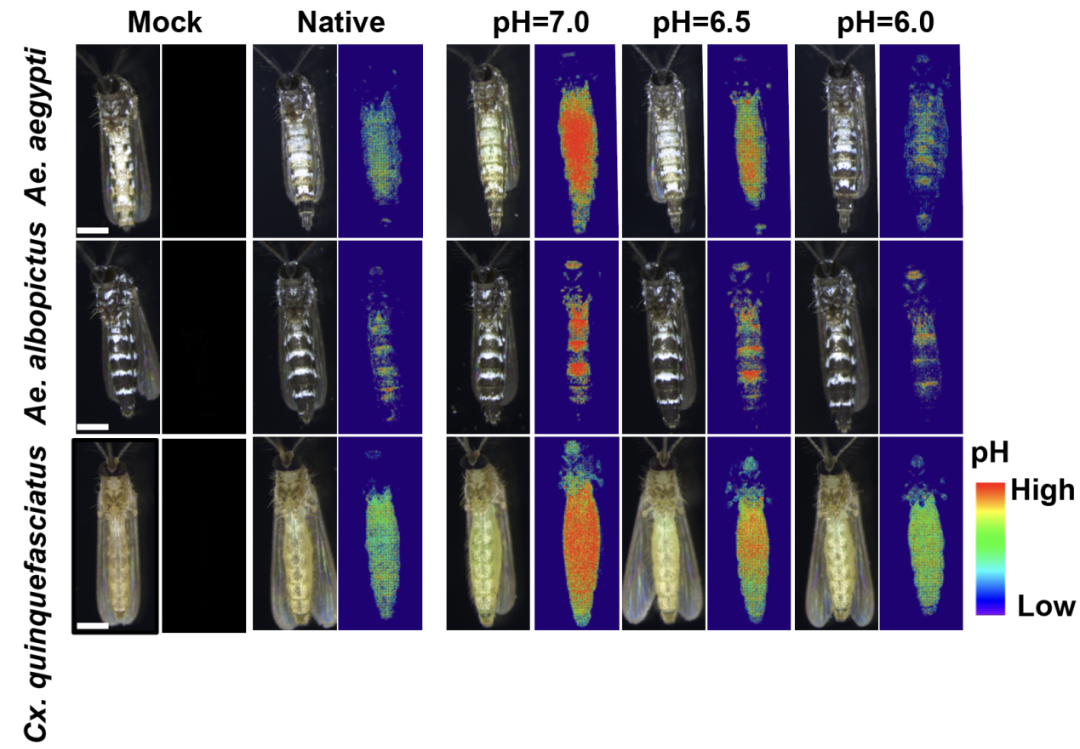 程功团队成员在进行蚊媒病毒其他方针的辅助数据测试时,有时发现埃及伊蚊、白纹伊蚊、致倦库蚊等主要蚊子的血淋巴呈酸性环境 (pH 5.9-6.1)。这一发现冲破了过往参谋的惯性想路,因为蚊媒黄病毒颗粒在pH<6.5的要求下会赶快失活,失去感染才智。这标明蚊子天然佩戴大批病毒,体内却莫得合适病毒颗粒存活的环境。