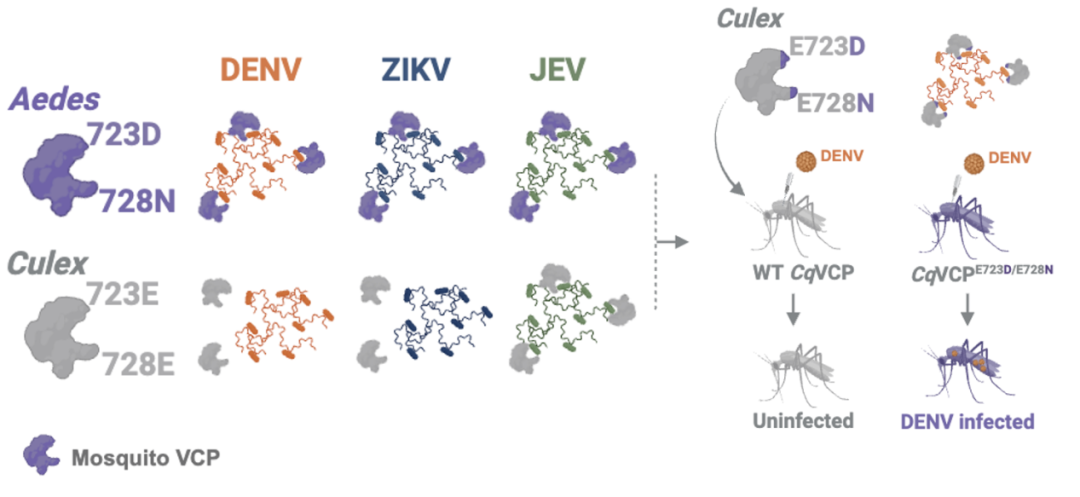 进一步参谋发现,VCP上的两个氨基酸是介导VCP与病毒衣壳卵白联接的关节氨基酸位点,不同蚊子的关节氨基酸位点相反是决定蚊子对不同病毒是否易感的分子开关。