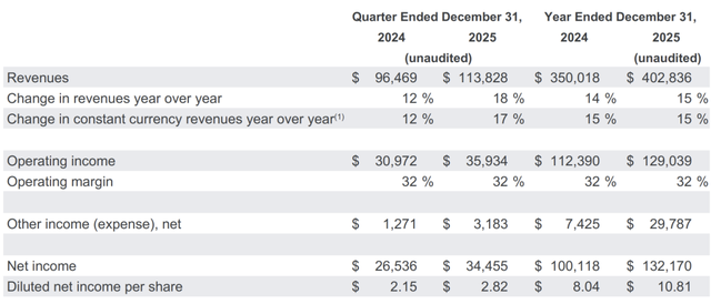 2025年全年,公司营收达到4028.36亿好意思元,同比增长15%;净利润达到1321.70亿好意思元,EPS为10.81好意思元。