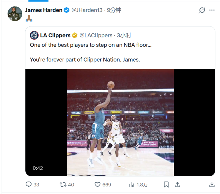 此外,哈登还转发了快船队问候我方的视频,快船队写说念:“历史上最伟大的球星之一,你将弥远是快船国家的成员!”