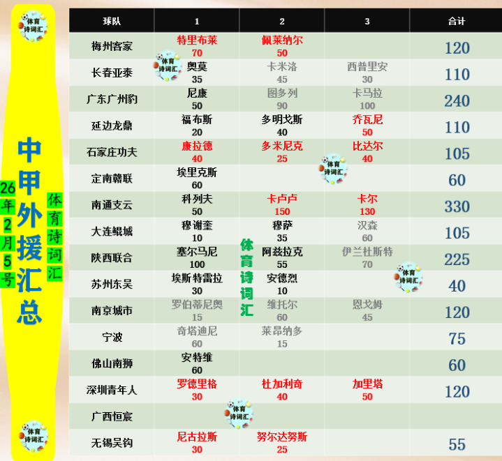 本赛季中甲外助计谋为4333,即全年累计注册4个,冬窗与夏窗齐只可注册3个,联赛报名3东谈主,首发亦然3东谈主。扬弃2月5号,中甲16支球队外助情况汇总如下,包括官宣的新外助、留队的外助以及外传外助。