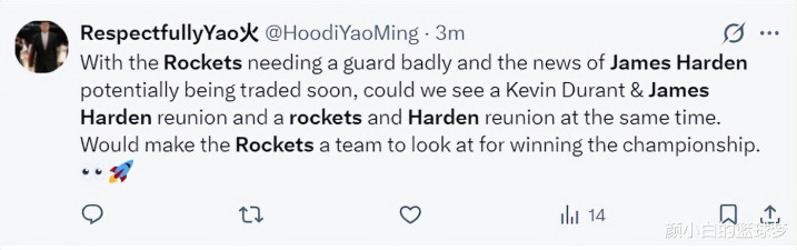 休媒Will:昆玉们,我真实但愿哈登能被交往回咱们身边,淌若有了他,咱们就能取得一切。