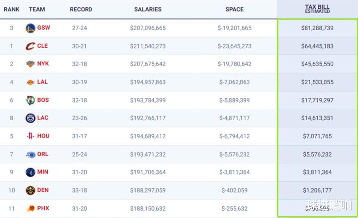 这让骑士队阔绰税降至定约第二,硬人队8129万好意思元阔绰税流露登顶定约第一。