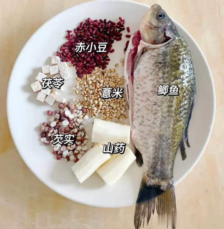 食材准备(2-3东谈主份):鲫鱼1条、赤小豆30g、薏米20g、茯苓15g、生姜3片、少量盐