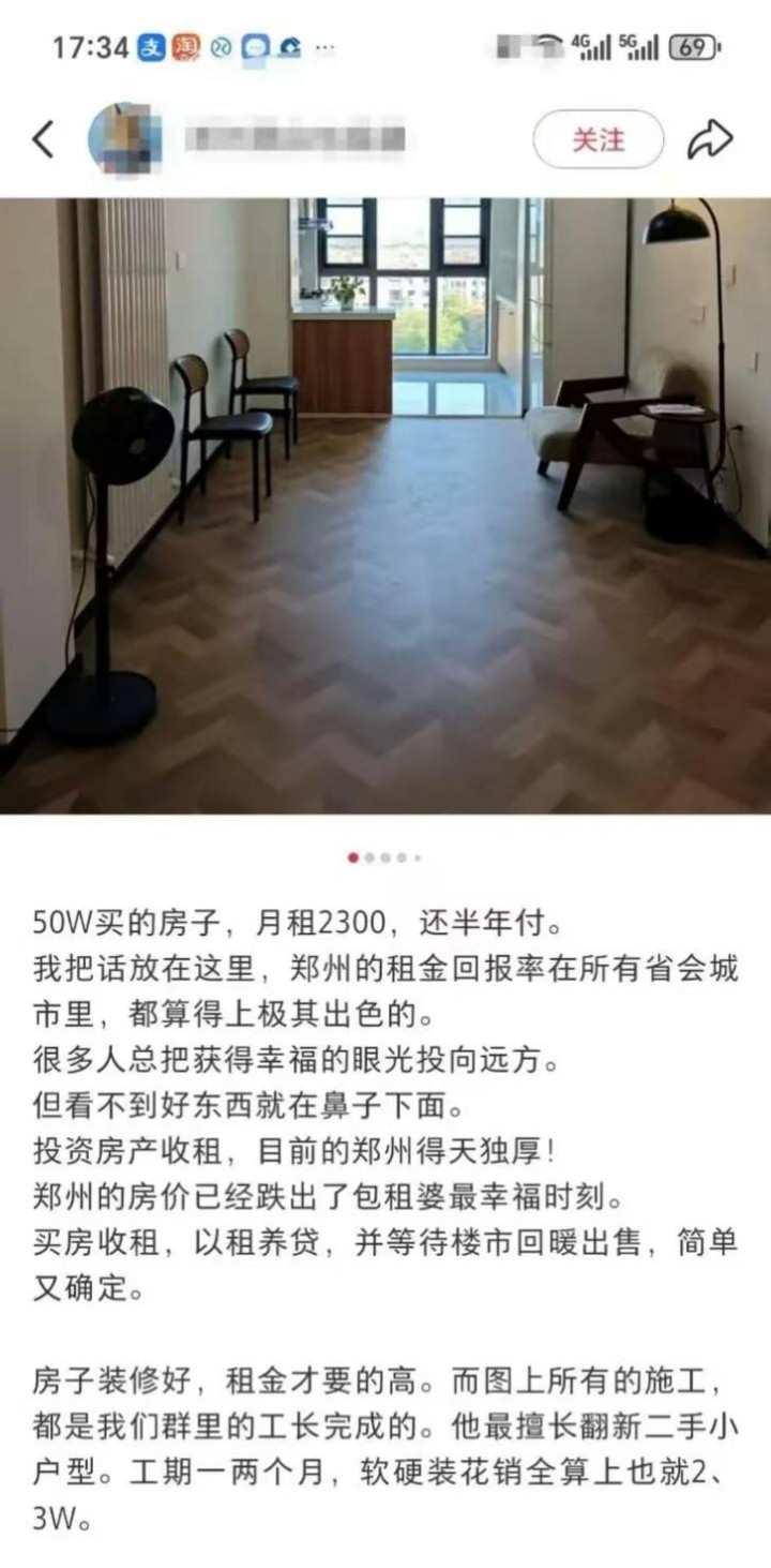 比拟前两者,郑州的一位博主的租售比达到了5.5%,她当今也曾伊始13套老破小了。