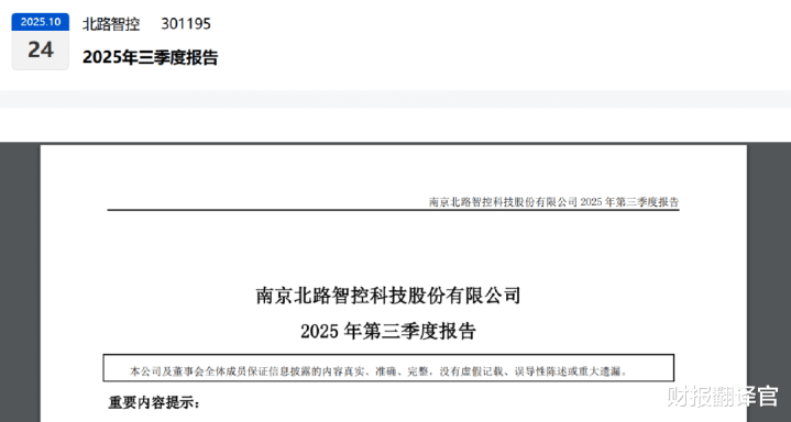 宇宙好,我是财官。一家叫北路智控的公司,最近被阛阓捧为“交易航灵活龙”和“机器东说念主冠军”,机构别传在抢筹。但当我大开它崭新出炉的三季报,一个夺办法数据平直蹦了出来:2025年前三季度功绩1.05亿,同比大幅下滑25.38%。