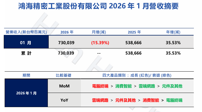 IT之家2月5日讯息,鸿海本日公告,2026年1月营收为7300亿元新台币(IT之家注:现汇率约合1612.57亿元东谈主民币),环比减少15.39%,同比增长35.53%,为积年同时最高(积年次高为2023年1月的6604亿新台币)。