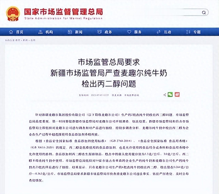 2022年6月,一切都变了。浙江省丽水市庆元县商场监管局抽检发现,麦趣尔两批次纯牛奶含丙二醇。这东西国度尺度不允许加在纯牛奶里,公司前处踏进手违法添加了食物添加剂,身分97.3%丙二醇、2.2%香料、0.5%水。