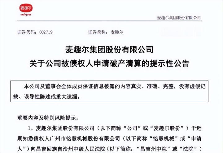 本年1月28日,麦趣尔公告说,广州市铭慧机械苦求公司收歇计帐。启事是850.7万的斥地公约,只付了30%首付255.21万,剩595.49万拖着不给。供应商屡次催收,致使苦求强制践诺,没用,只可出此下策。