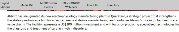 近日,雅培在在墨西哥克雷塔罗州(Querétaro)厚爱启用全新电生理制造基地。据悉,该基地总投资2亿好意思元(约合东说念主民币14亿元),将聚焦于心律失常疾病诊疗开导的研发、分娩。