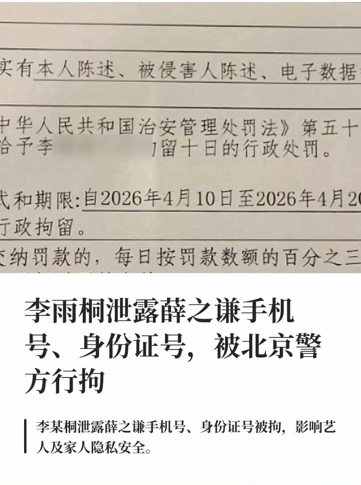 谁能思到,文娱圈吵了快十年的旧恩仇,临了竟以一方被送进拘留所实现,2026年4月19日,北京向阳警方的一纸通报,告成把李雨桐送进了风口浪尖,她因独特败露薛之谦秘密,被照章行政拘留10日,执行时候从4月10日到20日,这下算是绝对栽了。