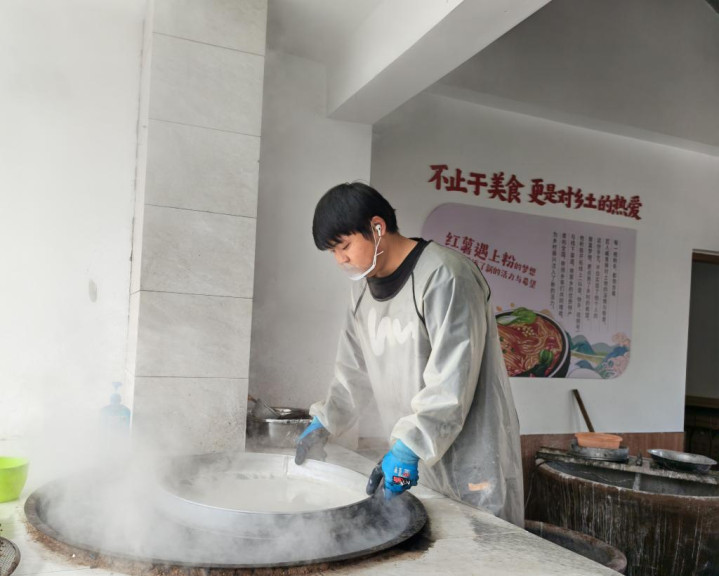 李庄村小微富民业态衖堂的食物作坊中,村民正在制作红薯粉皮。新华社记者张武岳摄