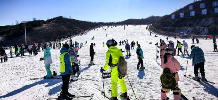 在济南市莱芜区的雪野滑雪场,旅客正在滑雪
