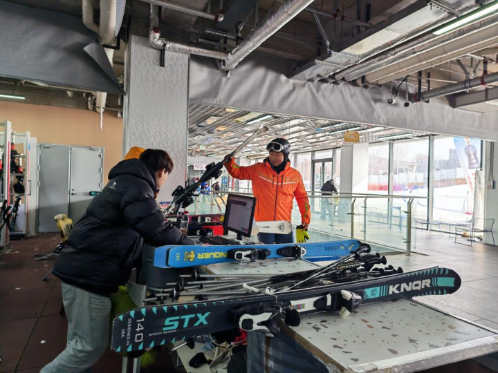 夹谷关滑雪场中,滑雪爱重者正在租雪具。新华社记者张武岳摄