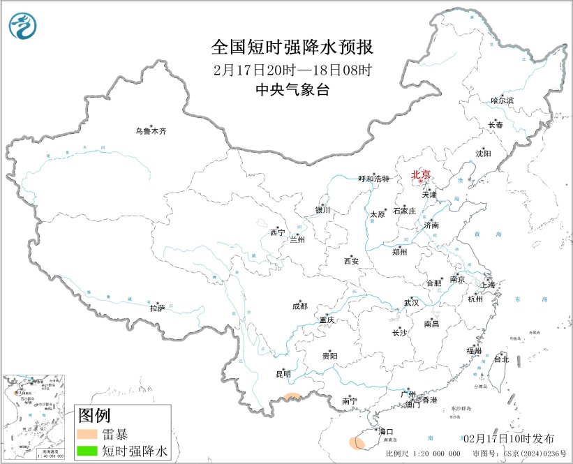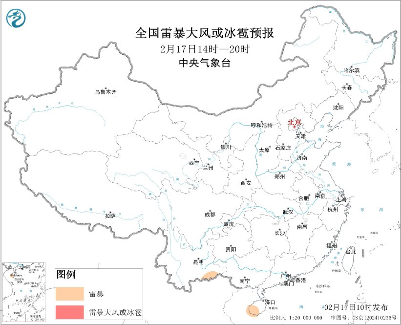 瞻望2月17日14时至18日08时,星空app登录云南东南部、海南岛西南部等地的部分地区将有雷暴天气。