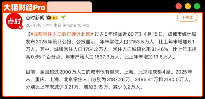 这两天成王人公布了常住东说念主口数目,5年本领抢了60万东说念主,常住东说念主口只比北京少26.5万,是东说念主口第四城。