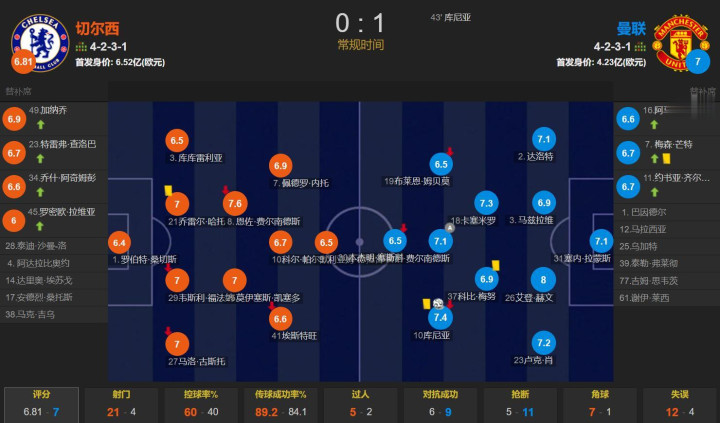 此役,切尔西在主场得宠不得分,控球率高达六成,狂射21脚,但仅有3次射正;曼联全场1次射正就打入制胜进球,反差弘大。罗塞尼尔亦然欲哭无泪,计谋照旧交代好,无奈锋无力,切尔西21次射门却换不来一个进球。